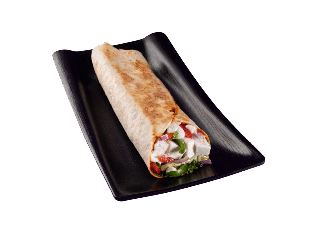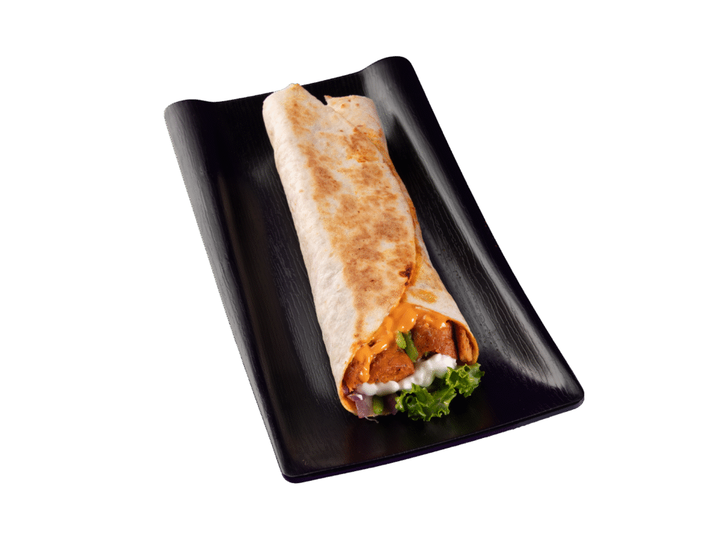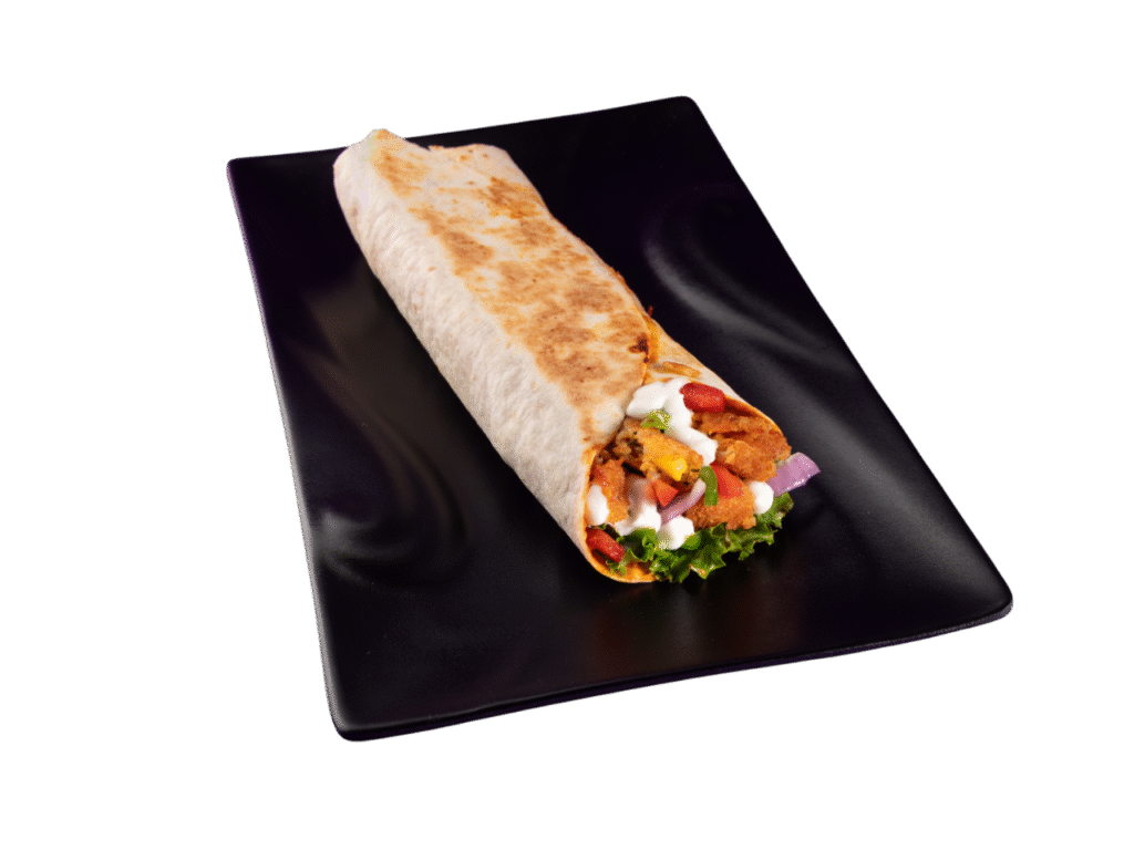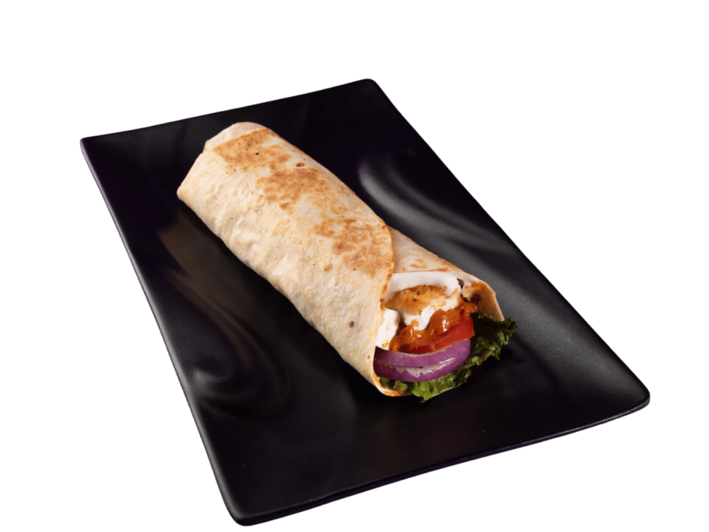 A Soft tortilla filled with fresh veggies, tender meat, creamy sauces, and bold spices – a perfect on-the-go meal packed with flavor.